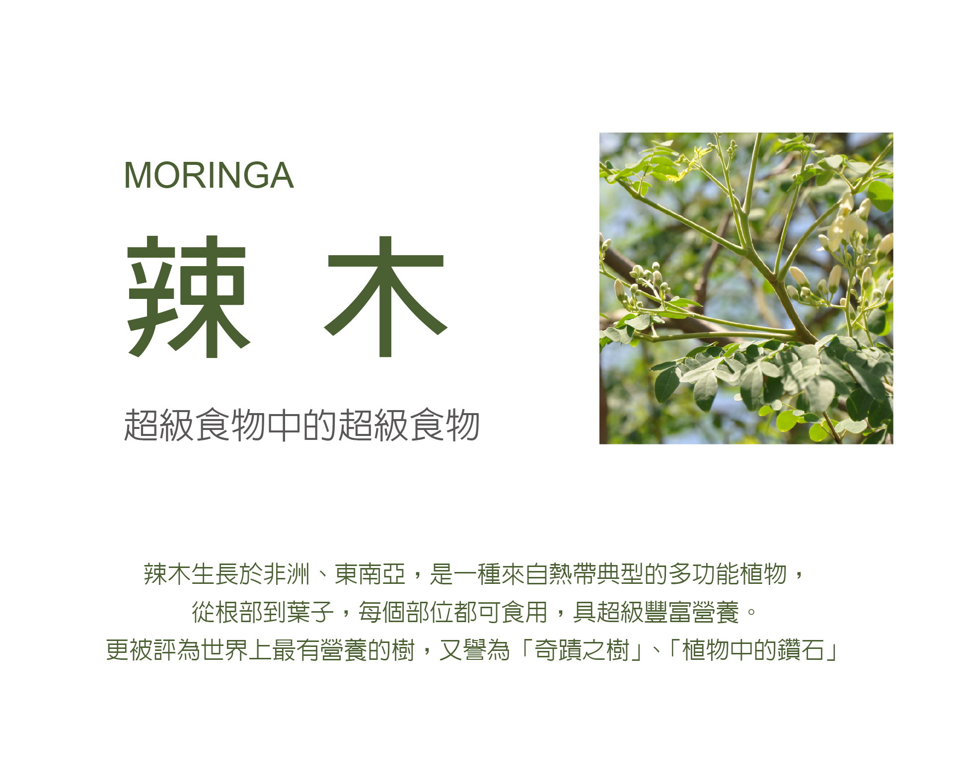 辣木生於非洲及東南亞,是一種來自熱帶典型的多功能植物, 從根部到葉子,每個部位都可食用,具超級豐富營養。 更被評為世界上最有營養的樹,又譽為「奇樹」、「植物中鑽石」 辣木對於腸道有各式各樣的幫助,可以用最天然的方式恢復腸道機能與健康。 辣木富含水溶性膳食纖維及非水溶性膳食纖維,能促進腸道蠕動,並提供益生菌絕佳生長環境,改善腸道健康。辣木含有豐富的維生素B6、菸鹼酸、葉酸等,能提供給腸道菌合成、製造更多人體的幸福荷爾蒙:血清素。不但能舒緩現代人的壓力、緊張問題,還能讓腸道蠕動正常,調整腸道環境。